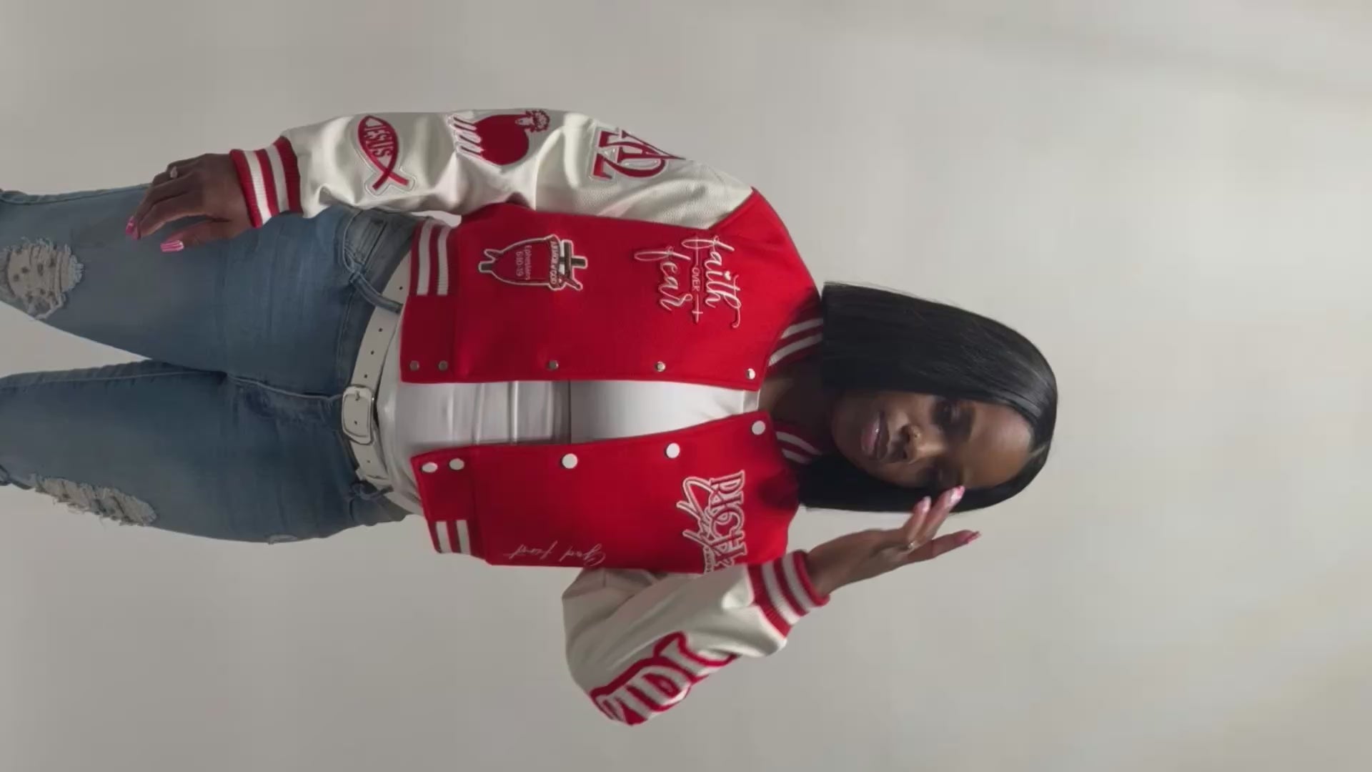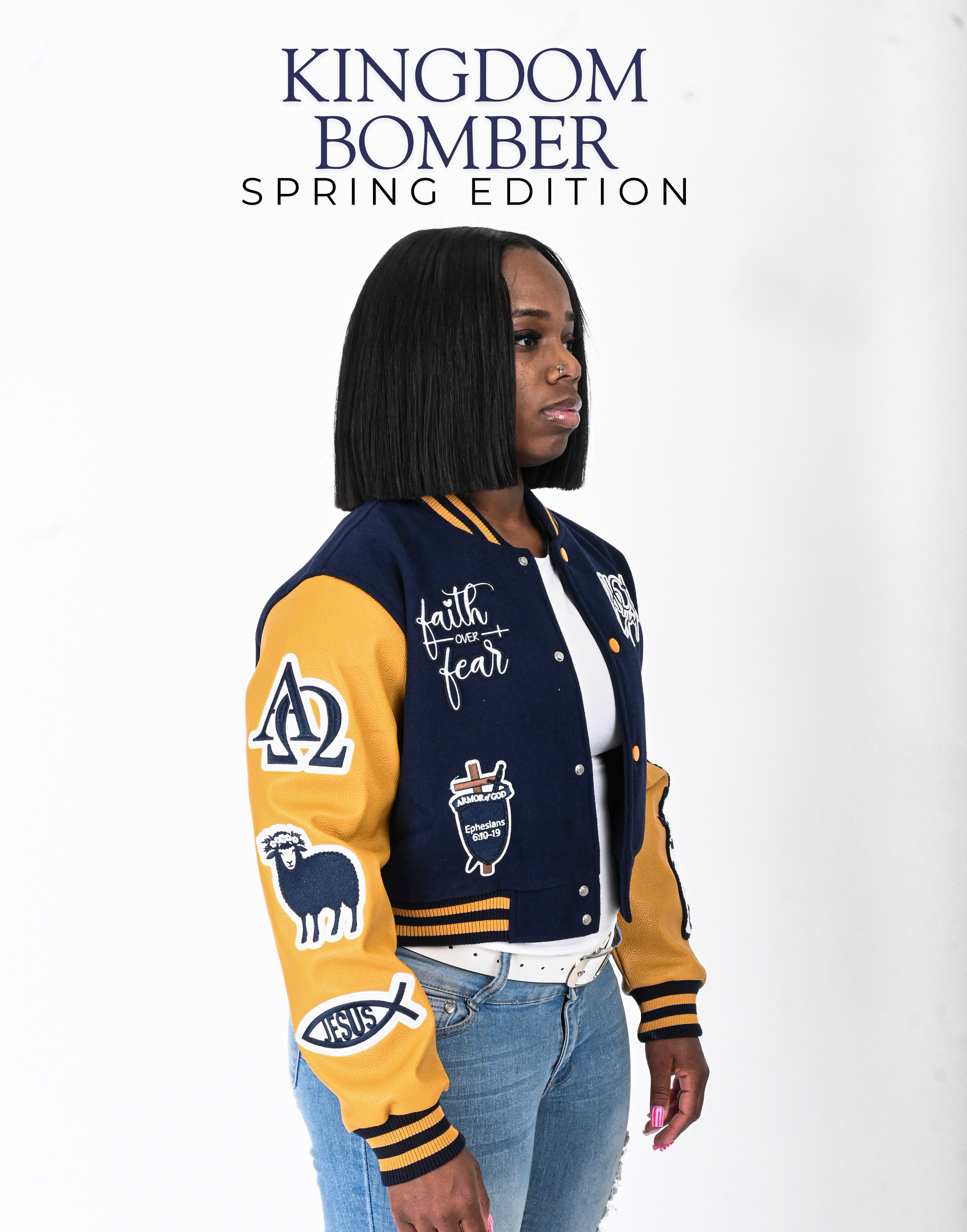 Crafted as a cropped length Kingdom Letterman with premium vegan leather sleeves and intentional detailing, this jacket is more than a statement, it’s a declaration. Every patch represents faith, protection, and purpose, reminding you to put God first and walk boldly covered in divine favor.